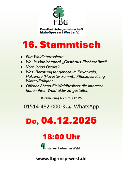 Weitere detaillierte Informationen werden wir in der nächsten Waldpost sowie an unserer Jahreshauptversammlung am 19.04. in Bergrothenfels bekannt geben.